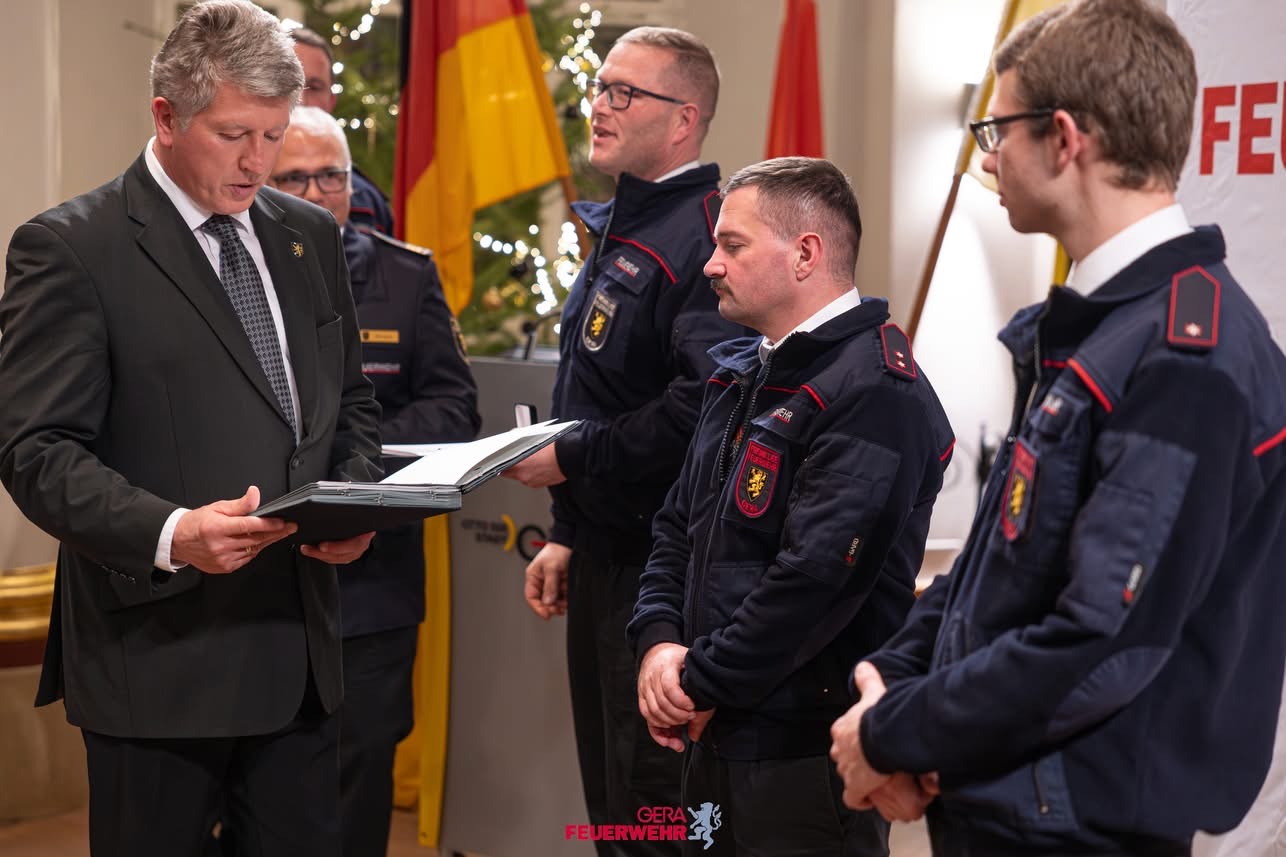 Am 04. Dezember fand im Rathaussaal die gemeinsame Ehrungsveranstaltung der Feuerwehr Gera und des Stadtfeuerwehrverbandes Gera statt. In einem würdigen Rahmen wurden zahlreiche Kameradinnen und Kameraden für ihr Engagement ausgezeichnet. Auch aus unserer Wehr durften wir vier Ehrungen feiern.